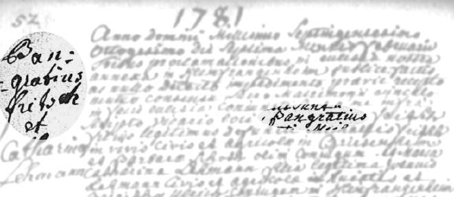 En consultant mon entourage, F. (qui a souhaité rester anonyme ;-) ) m’a suggérée une hypothèse intéressante: et si c’était Pancrace? Effectivement, phonétiquement, on peut imaginer un germanophone dire son prénom à un francophone - Pancrace s’écrit Pancraz en allemand. Nous sommes en 1807, il y a peut être eu confusion entre l’allemand et le français. Déterminé à prouver cette hypothèse je me lance dans la recherche d’actes de cet individu. Je tombe dans un premier temps sur son acte de mariage. Mais là, malheureusement, l’acte en latin mentionne le prénom Brangratius! Le prêtre à traduit en latin, un prénom introuvable! Il était peut être lui aussi plus francophone (?).