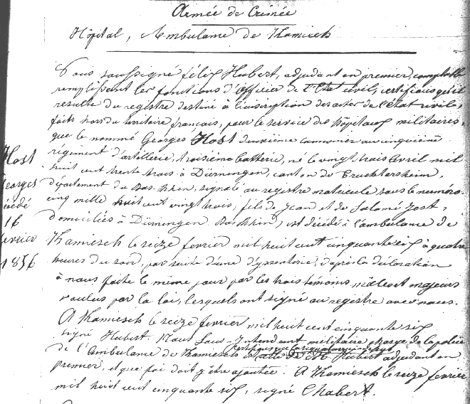 Il arrive parfois que l’acte de décès soit remplacé par la lettre de l’armée décrivant les détails du décès. C’est sur quoi je suis tombé dans un livret d’état civil de 1856. Un acte de décès provenant de Kamiesch, près de Sebastopol.