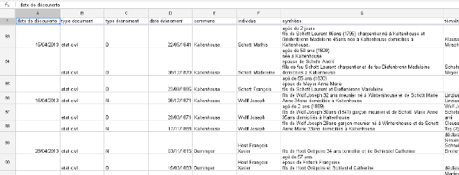 Plus structuré que le précédent, le nouveau journal me permet par le jeu des filtres du tableur de trouver les informations d’un individus, d’une commune, ou d’une même date. L’entête est comme ceci :