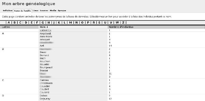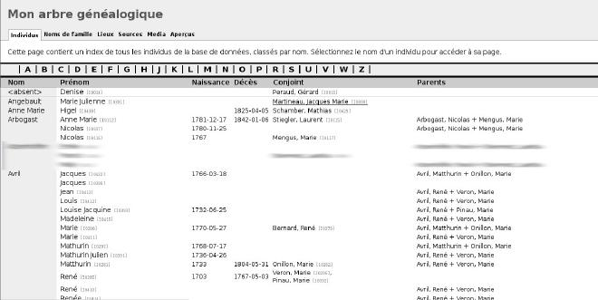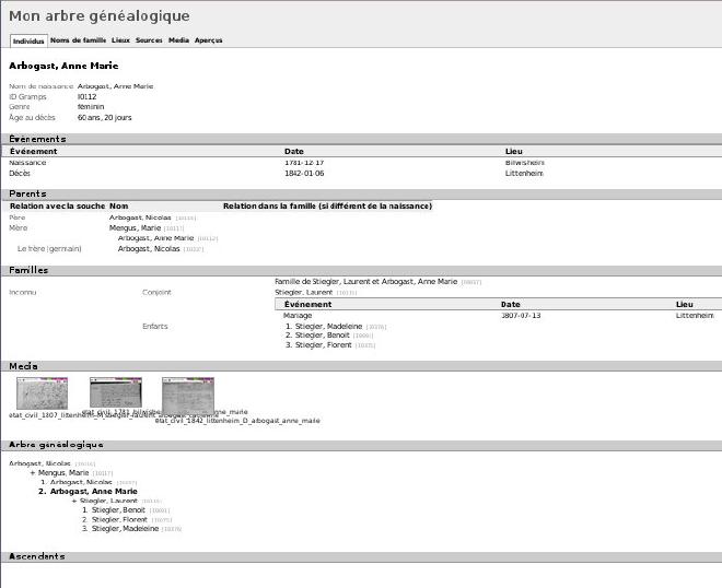 Mon logiciel de généalogie, GRAMPS, permet, de base, d’exporter la base sous la forme d’un site web (page en anglais). Il est ainsi possible de mettre à disposition, sur un site web, l’ensemble des informations : documents, fiches individuelles, relations. Voilà quelques captures d’écran.