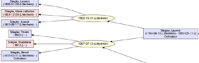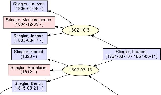 Je souhaitais aussi mettre en ligne la base sous forme graphique. Sous Gramps, il est possible de sortir un diagramme relationnel. Celui-ci diffère des diagrammes des ascendants ou de lignée familliale par le fait que tous les individus sont affichés : frères et soeurs, famille des épouses…