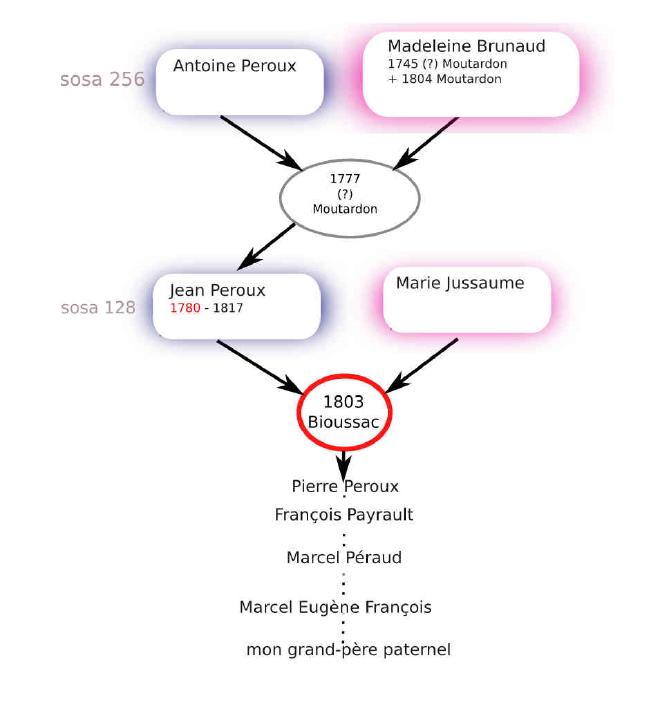 Grâces aux indications précises de l’acte de mariage, j’apprend que Jean Peroux est né le 29 juillet 1780 à Moutardon et est le fils de feu Antoine Peroux et de Madeleine Brunaud demeurant au hameau de Chez Roux.