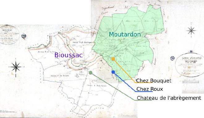 Dans ces 2 communes, 3 lieux ont été identifiés : les hameaux de Chez Roux et de Chez Bouquet et le château de L’abrègement. Voilà un collage des cadastres de 1819 des communes de Bioussac et Moutardon (que vous pouvez consulter ici et ici.