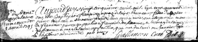 J’ai retrouvé l’acte de baptême d’une Françoise Magdeleine Brunaud du 25 avril 1745 à Moutardon fille de Pierre Bruneau et Marie Ponbelle. Celà pourrait faire la liaison avec les 2 actes précédents, augmentant ainsi les chances que le Antoine de l’acte de 1777 soit bien celui qu’on cherche. Mais on est encore loin d’avoir enlevé tous les doutes…