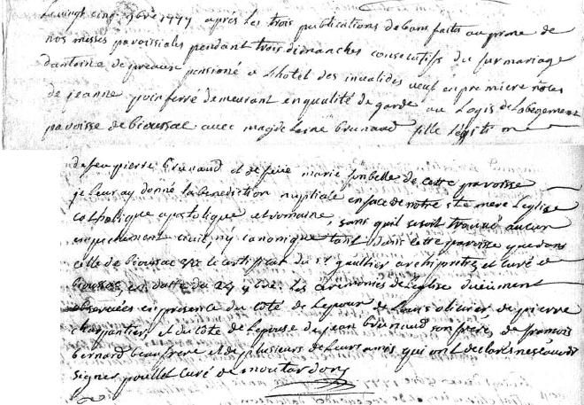 Je n’ai pas réussi à trouver l’acte de décès d’Antoine Peroux ni à Bioussac ni à Moutardon. Je sais que je peux le trouver entre 1780 et 1803 mais je ne sais où. J’ai également cherché l’acte de mariage de la première noce dont il est fait mention dans l’acte de mariage de 1777.