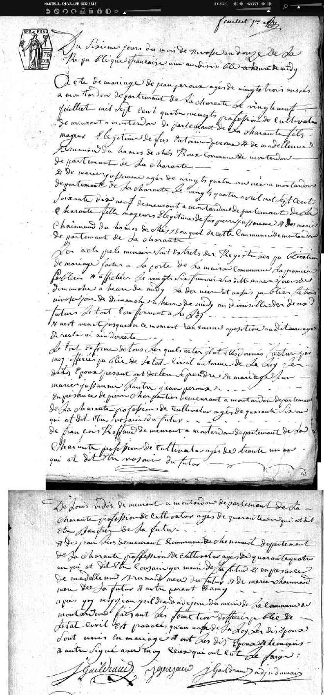La première mention de Antoine Peroux que j’ai trouvée est dans l’acte de mariage de Jean Peroux et Marie Jussaume à Moutardon de 6 Nivôse an 12, qui correspond au 28 décembre 1803 - j’en ai déjà parlé dans l’article Une histoire de cousins germains -.